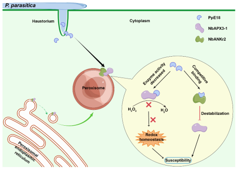 研究发现蛋白抗坏血酸过氧化物酶NbAPX3-1主要在过氧化物酶体发挥功能,是植物免疫的正向调控因子,其活性氧(ROS)清除活性对免疫功能发挥至关重要。研究揭示了寄生疫霉保守的毒力效应分子PpE18通过调控寄主植物NbAPX3-1 的生物活性、干扰 NbAPX3-1 的免疫功能而抑制植物免疫的分子机制,为深入理解植物的感病性和探索作物抗病新策略提供了思路。